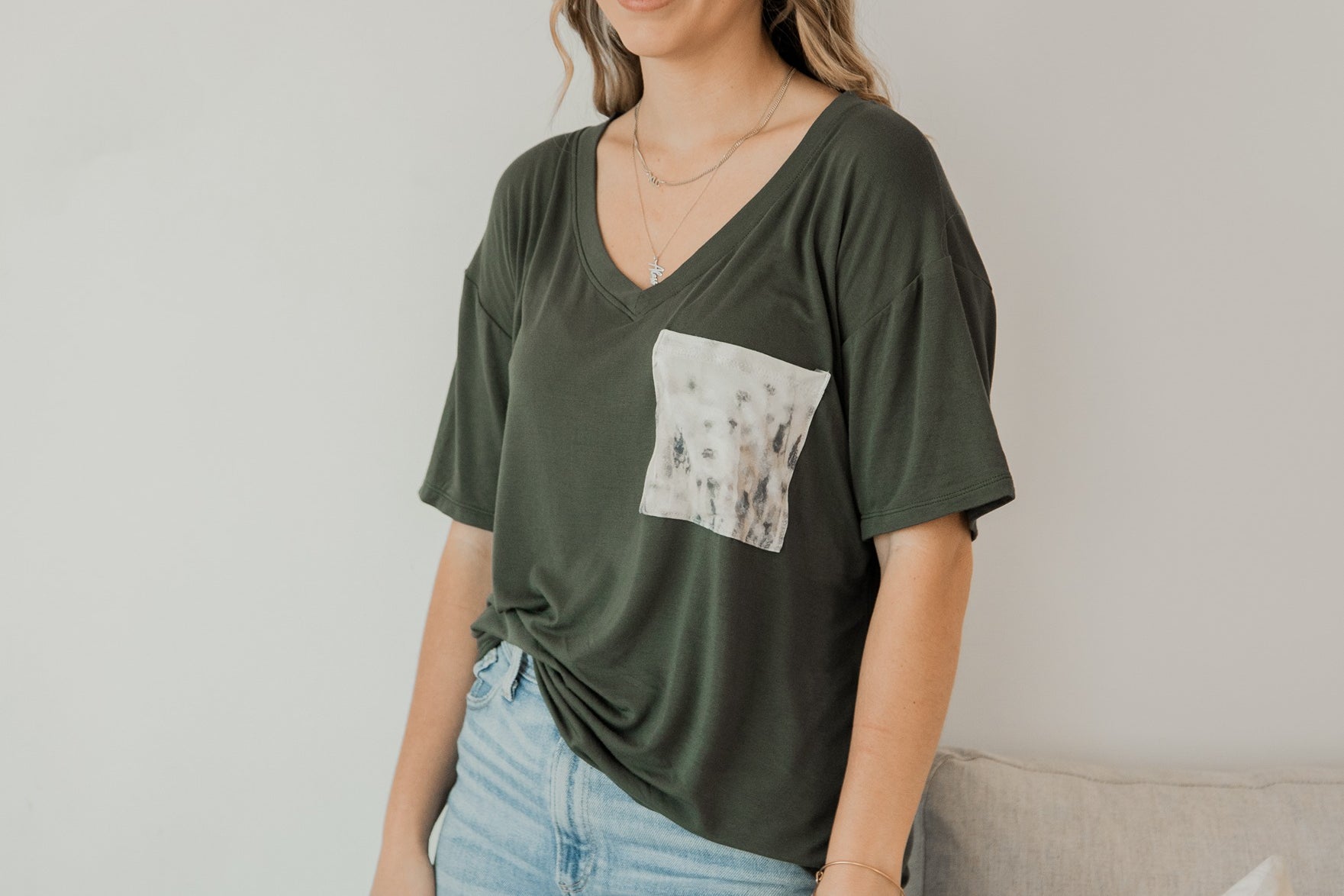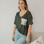 From workdays to weekends, this super soft, breathable bamboo tee is versatile and comfortable, so you always look and feel your best. The patterned pocket makes it easy to coordinate your outfit with your family so you look totally put together, even when you don’t feel like you are! The stylish, modest V-neck is fashionable and functionable (stretchy enough for nursing!).